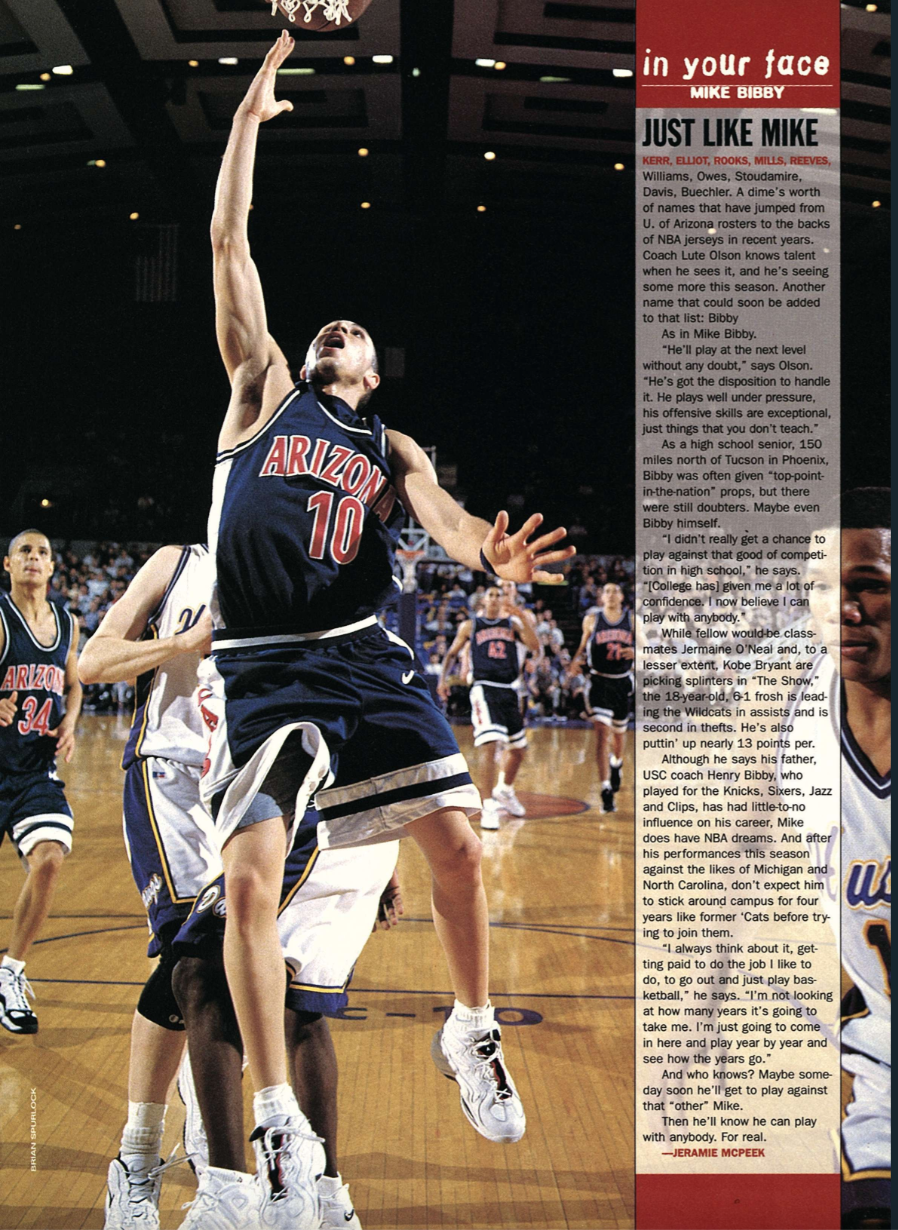 “Mike Bibby brought that swag to our team because when he came in, he got the standard issued team shoe, and right away he was like, ‘Ahh, nah. I ain’t wearin’ these,’’ remembers Terry of his introduction to the brash freshman. “He immediately went to the store on campus and bought a pair of Jordans. Then everybody followed and wanted the hottest shoe out. Mike Bibby spearheaded that shoe movement.”