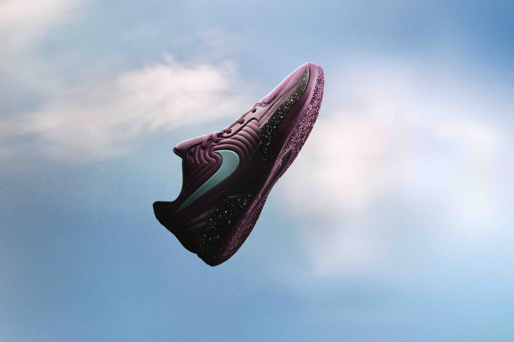 On top of the personal memories exists a collection of shades and tones that aim to evoke the same feelings we all experience when watching No. 12. The “Purple Sky colorway paints that on-court energy in a galactic collection of plums, mismatched neon Swooshes and paint-splattered midsoles echoing the sights of the night sky.