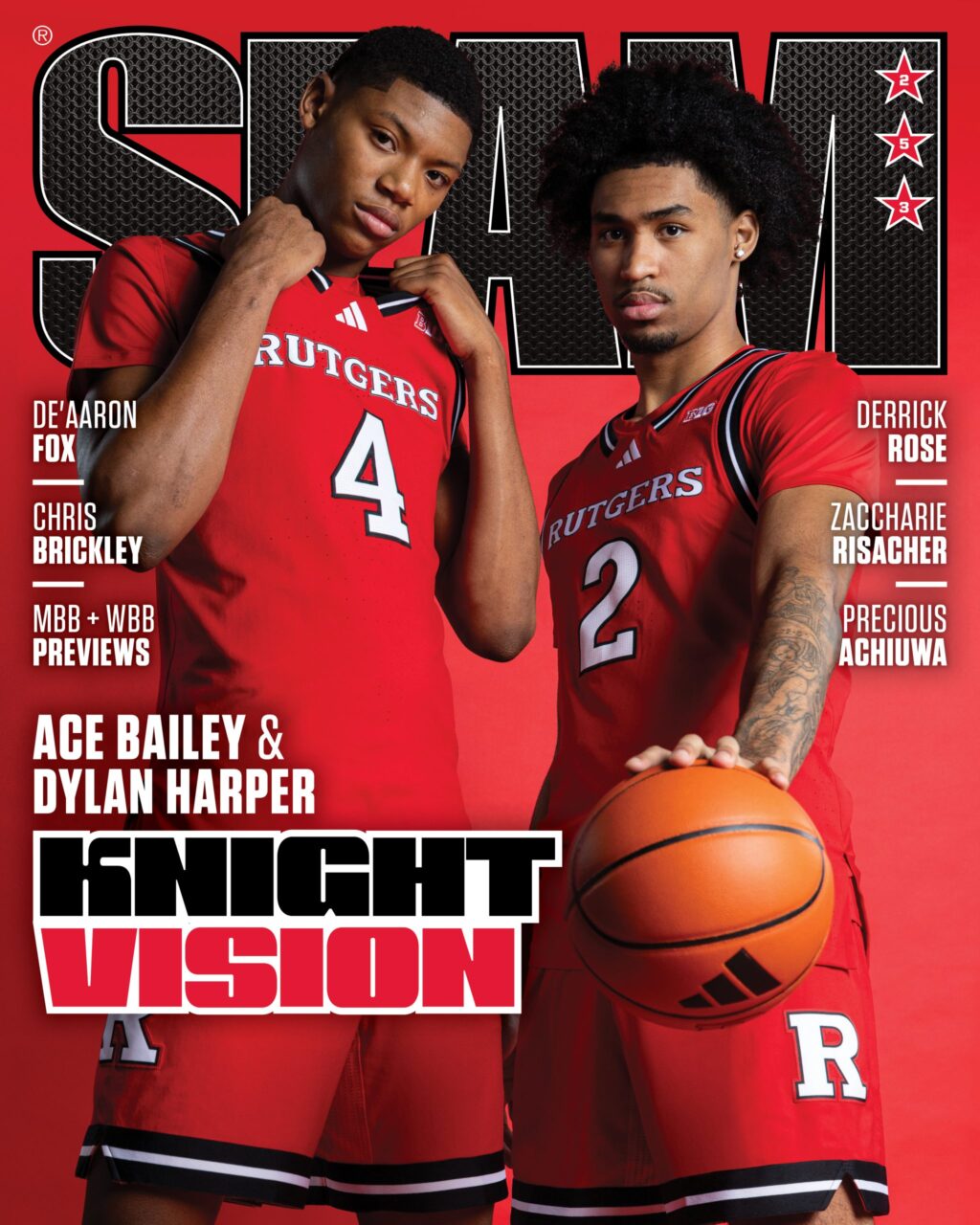 Dylan holds the adidas basketball stamped with the Rutgers R and stands to the right. Ace, who’s wearing a black sweatsuit with red accents from the Lifestyle Sports Agency, which was founded by Sharife Cooper’s dad, Omar, and currently reps the Tennessee native, stands to the left with room in between them. They wave someone over and Dylan asks if they want to hold the ball. They smile while a friend takes the photo. A few dap-ups follow and encouragement for the season, then it’s off to class, the dining hall or the dorm. After about five minutes, the line disperses, and Ace and Dylan go right back to posing for their SLAM cover shoot.