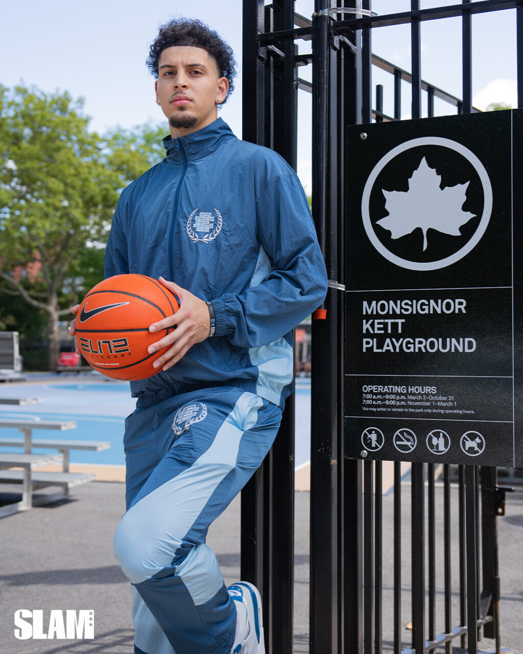 Fifteen years after first being introduced to the concrete courts, Koby is back at Dyckman. It’s a piping hot mid-August afternoon and the sun is unrelenting. Pay it no mind, Koby’s suited in a full Eric Emanuel baby blue tracksuit with matching “Industrial Blue” Air Jordan 4s on-foot. After watching him learn to play and eventually compete in the summer Dyckman tournaments, his father, mother and youngest brother Tyler now stand off to the side as we snap photos. It’s a family affair. For the Breas and Washington Heights, that’s always been the case.