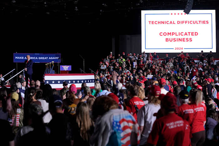 It was the second time in a week that one of his events was interrupted — though the last time, on Monday, Trump cut off a town hall and instead played music after multiple people in the audience needed medical attention. This time, Trump appeared to have little control over the matter, standing silently while the screens in the room displayed the messages “Technical Difficulties” and “Complicated Business.”