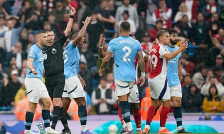Mikel Arteta remained tight-lipped in a press conference after Manchester City’s 2-2 draw with Arsenal at the Etihad Stadium. When asked about Leandro Trossard’s second yellow card for kicking the ball away after a foul, the Arsenal manager said: ‘I’m expecting now 100 Premier League games to be played 10 against 11 or 10 against 10 or 9 against 10.’ It is the second time this season that an Arsenal player has been sent off for kicking the ball away after Declan Rice was dismissed against Brighton.