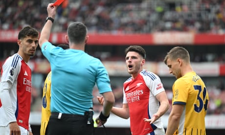 Arsenal had looked on course to maintain their 100% start to the new campaign when Bukayo Saka pounced on a mistake by Lewis Dunk to set up Kai Havertz. But an incident early in the second half when Rice, who had never been sent off before in his career and will now miss the north London derby against Tottenham after the international break, was shown a second yellow card by referee Chris Kavanagh after being deemed to have obstructed Joël Veltman from taking a free-kick altered the momentum of the game entirely.