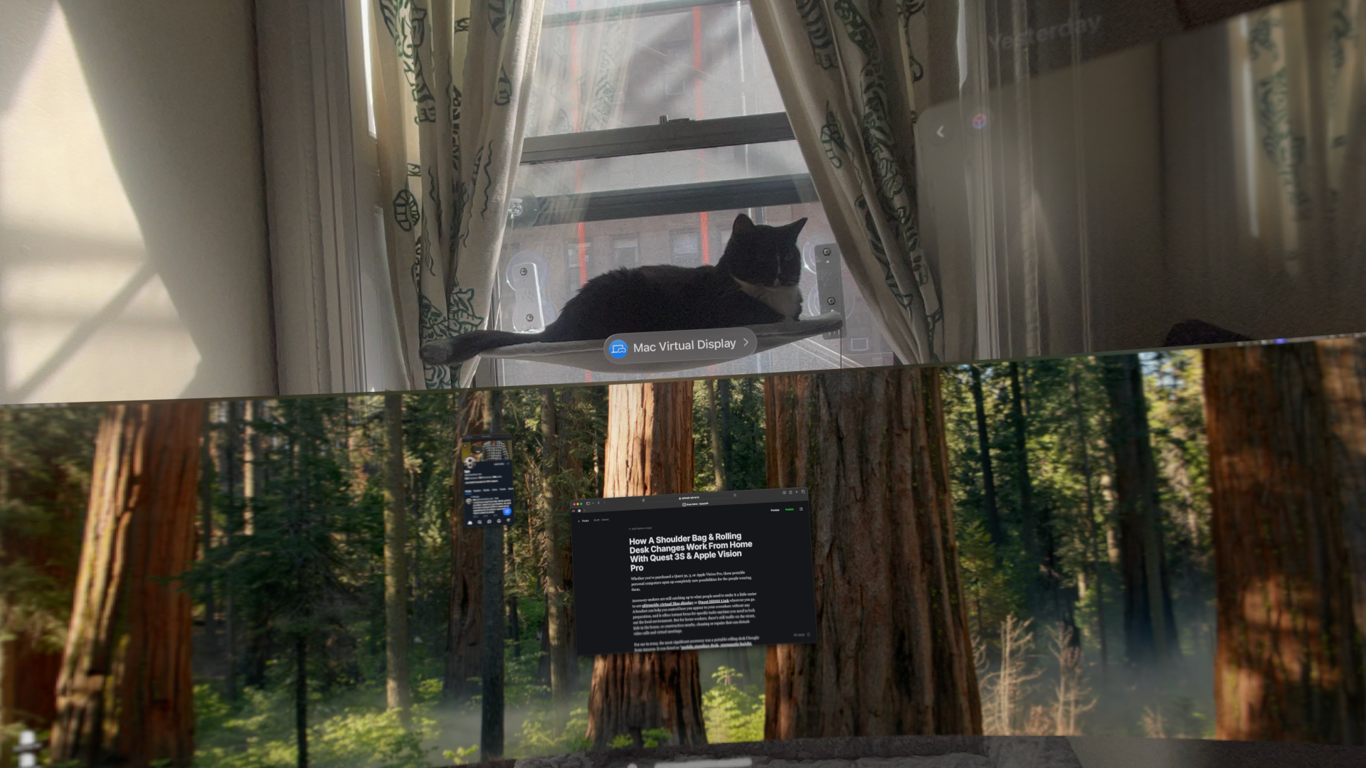 If your desk shrinks to become an anywhere office, whatever space you had dedicated to your office before is now multi-use. Assuming you can touch type, you could add a monitor stand with cat bed atop to transform the desk into a cat stand with keyboard nook. As Hopper demonstrates above, there’s still full access to input devices alongside ideal placement for a giant virtual display.