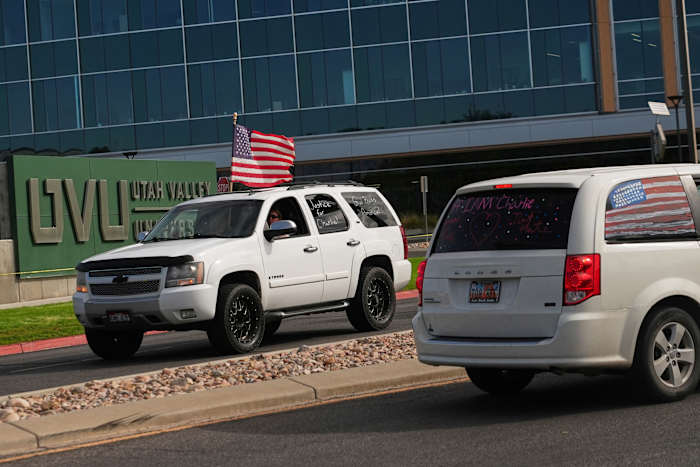 At a makeshift memorial near Utah Valley University’s main entrance in Orem, people have been leaving flowers. Cars looped nearby streets Saturday, honking horns, flying American flags and displaying messages such as “We love you Charlie,” “Charlie 4 Ever” and “RIP Charlie.”