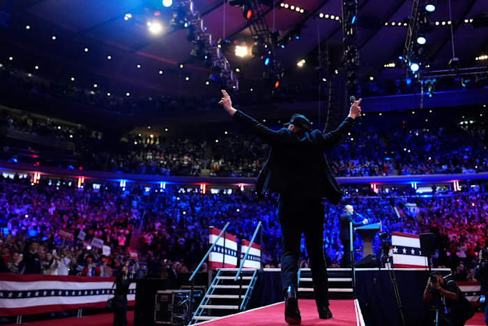Tech mogul Elon Musk, who spoke earlier and introduced Melania Trump, was a prominent part of Trump’s closing campaign message. The former president called Musk “a genius” and “special.”